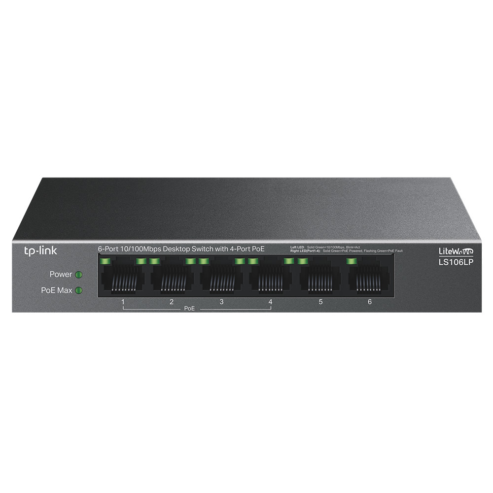 TP-Link Switch 6x100Mbps (4xPoE) fémházas, asztali, LS106LP